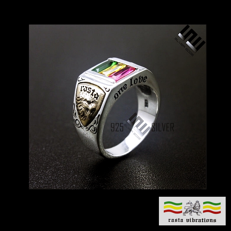 銀革手作 日本 rasta vibrations 925 純銀 麻葉 獅子 one love one heart 三色寶石 戒指