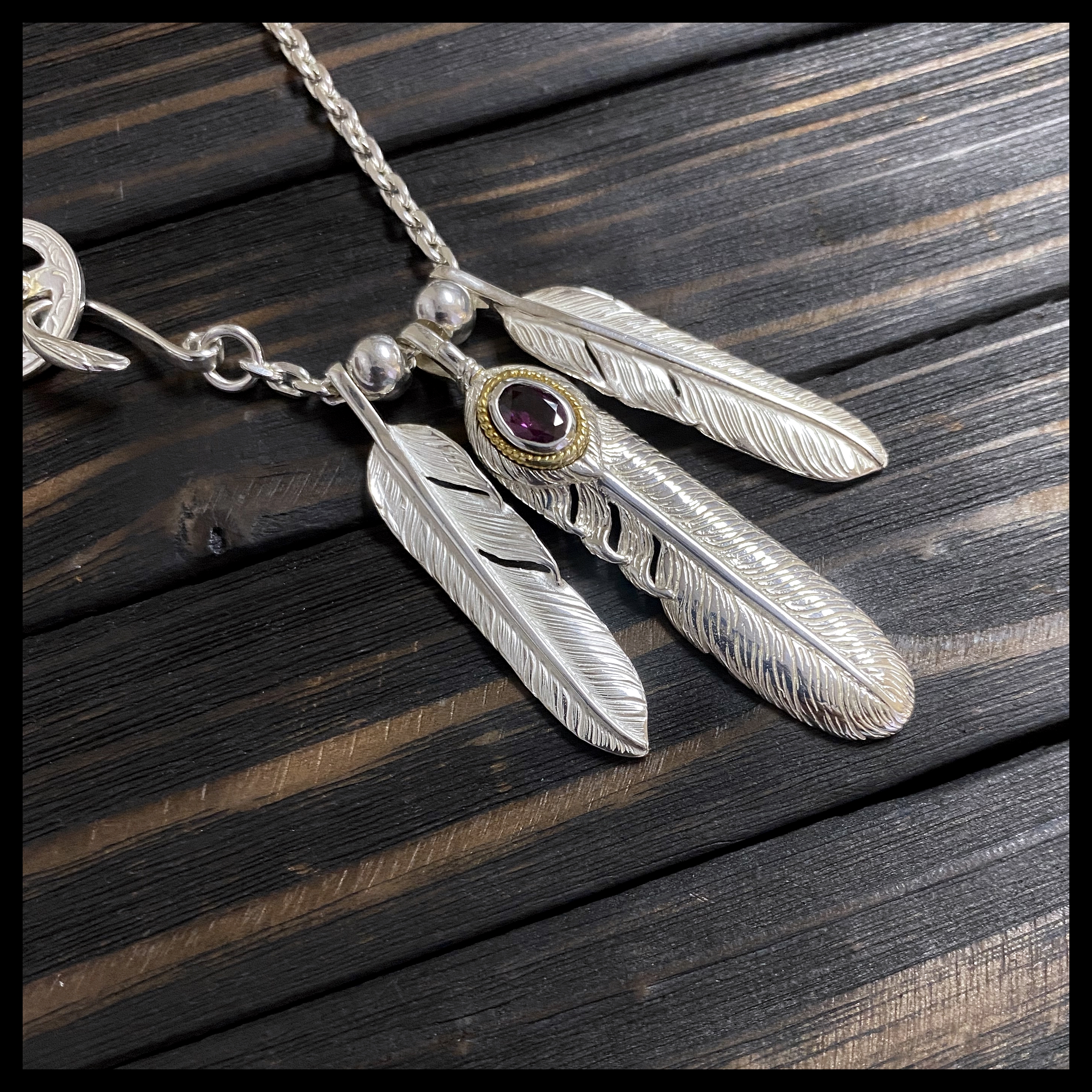 銀革手作 925 純銀 櫻花輪 石榴石 金繩 羽毛 feather set