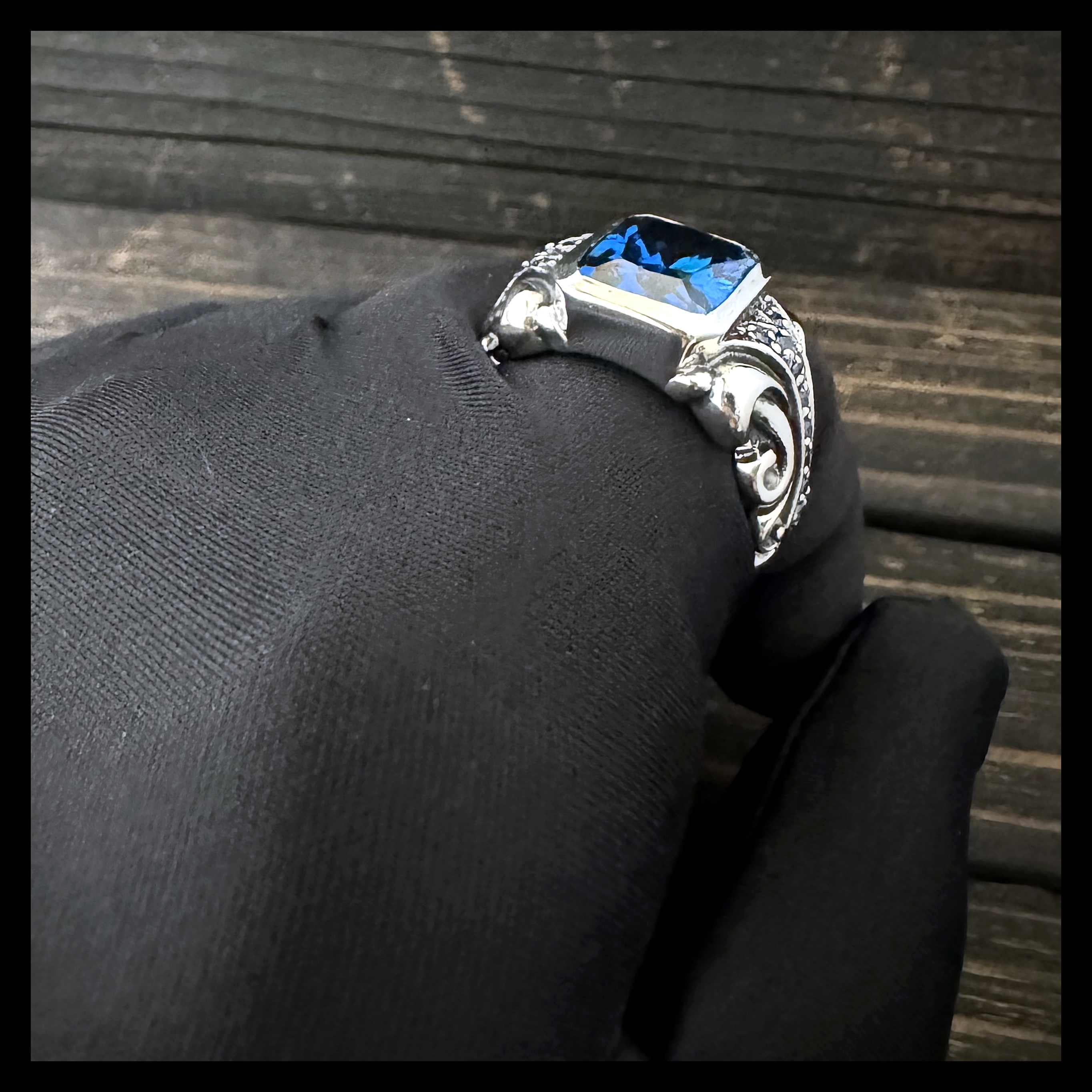 銀革手作 925 純銀 藍鋯石 華麗唐草紋 戒指