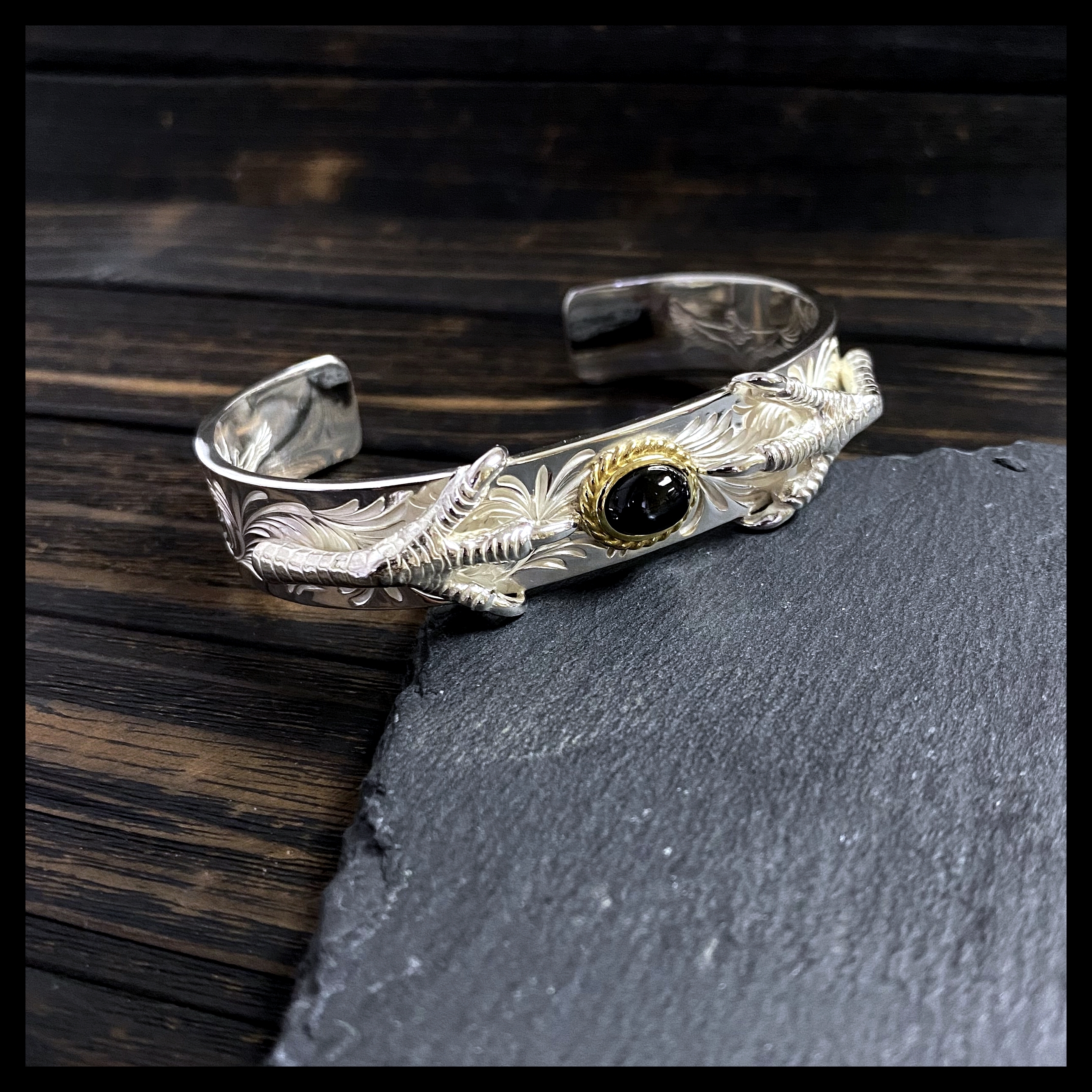 銀革手作 925 純銀 黑星石 18K金繩 銀爪 唐草紋 手鐲