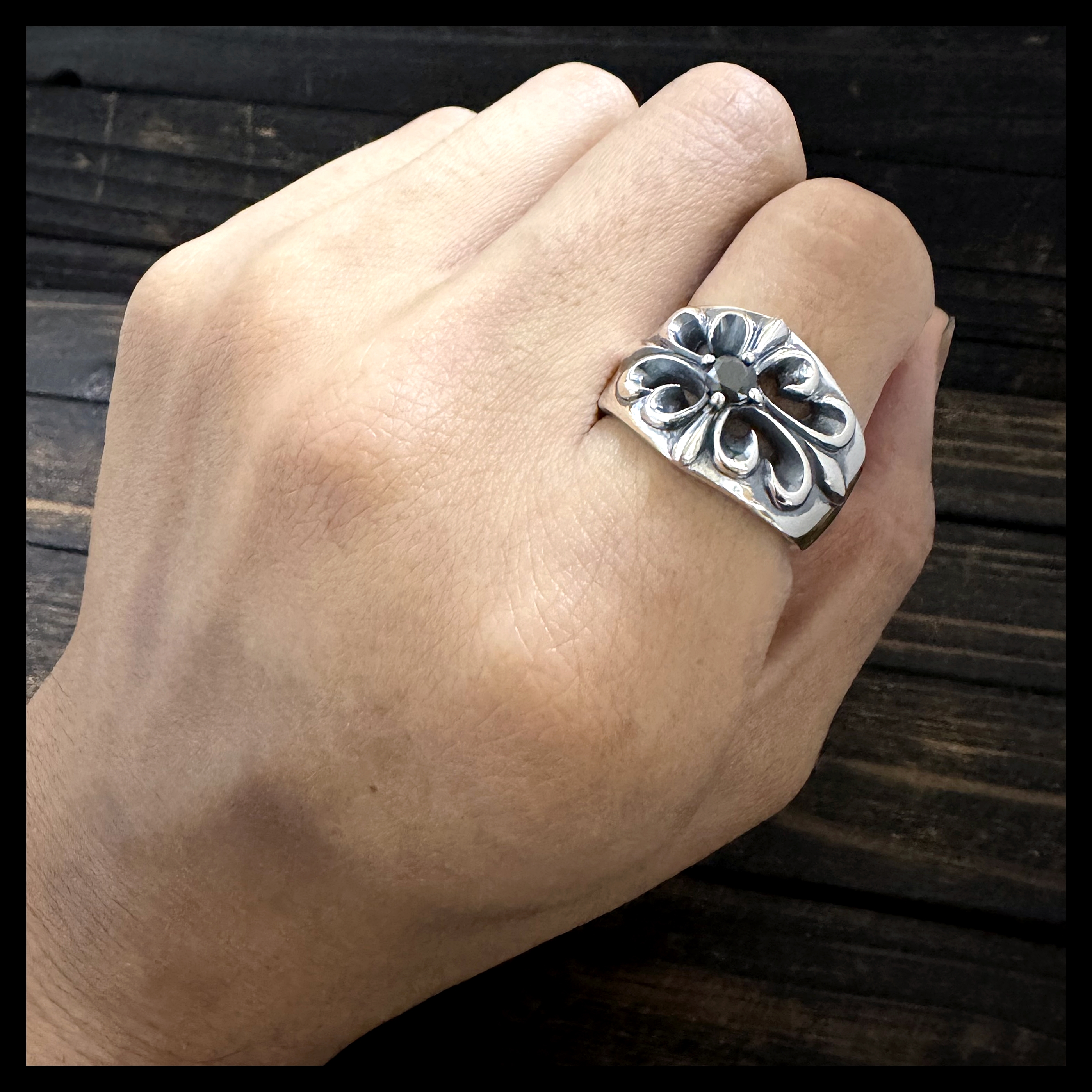 銀革手作 925 純銀 黑鋯石 鏤空 十字紋 戒指